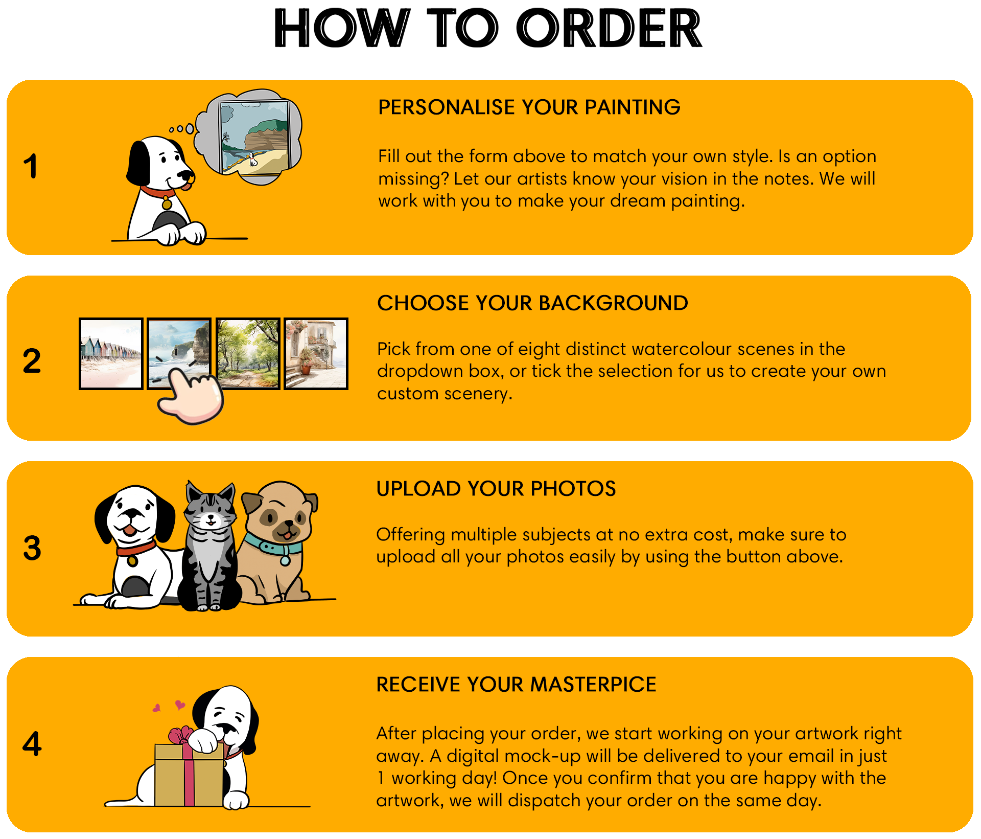 Our talented artists utilise a wide array of artistic techniques to offer you the most striking and memorable pet portraits. At CMZ art, we provide an unparalleled selection of art styles and unique customisations, you wont find anywhere else!