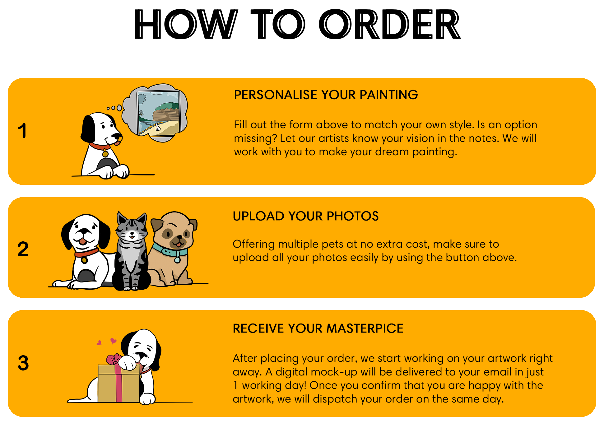 Absolutely! CMZ Art is unique because we let you include as many pets as you want, even from different photos. Our expert designers will combine them beautifully to create a perfect masterpiece. Simply upload all your photos above.