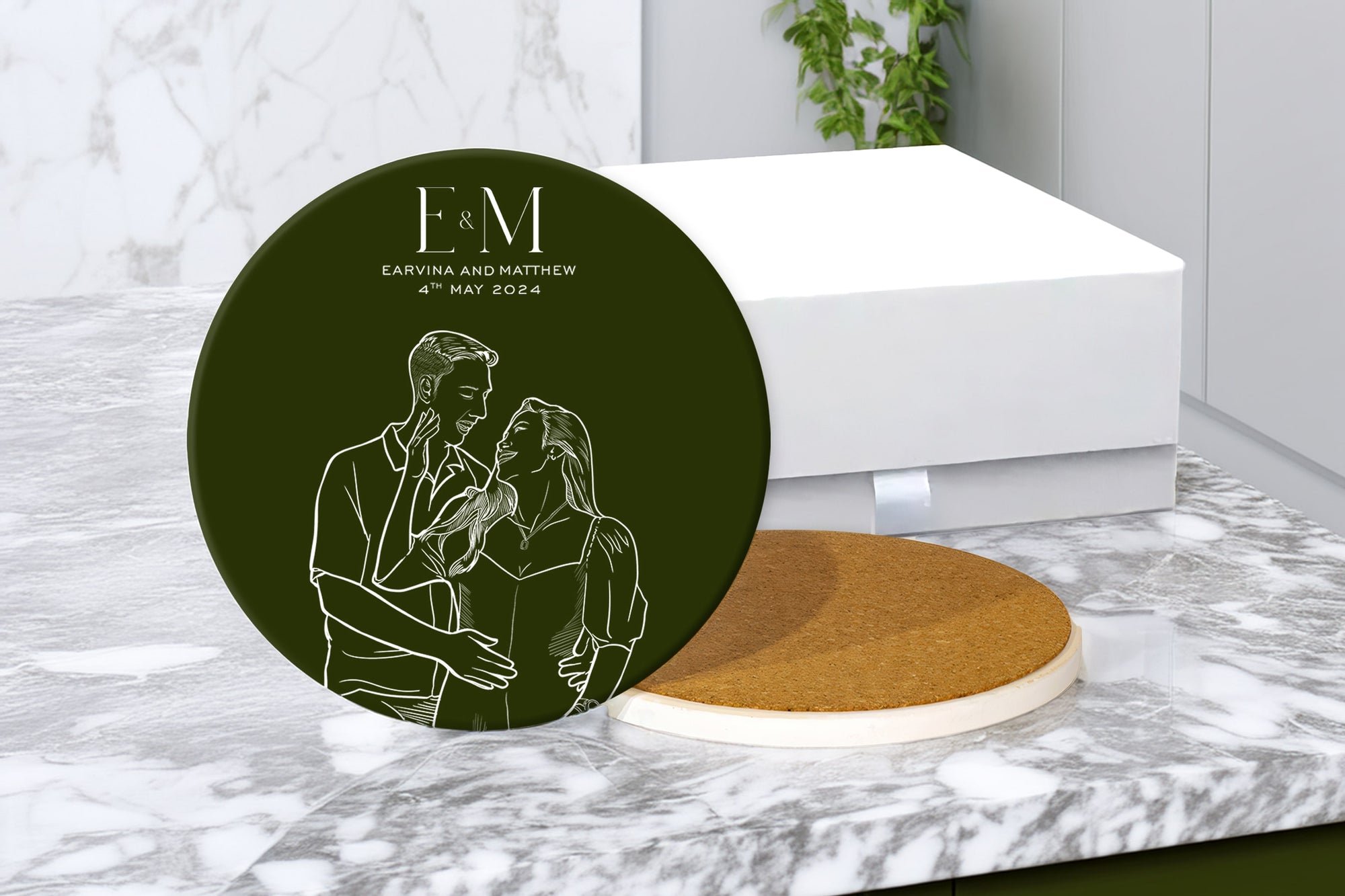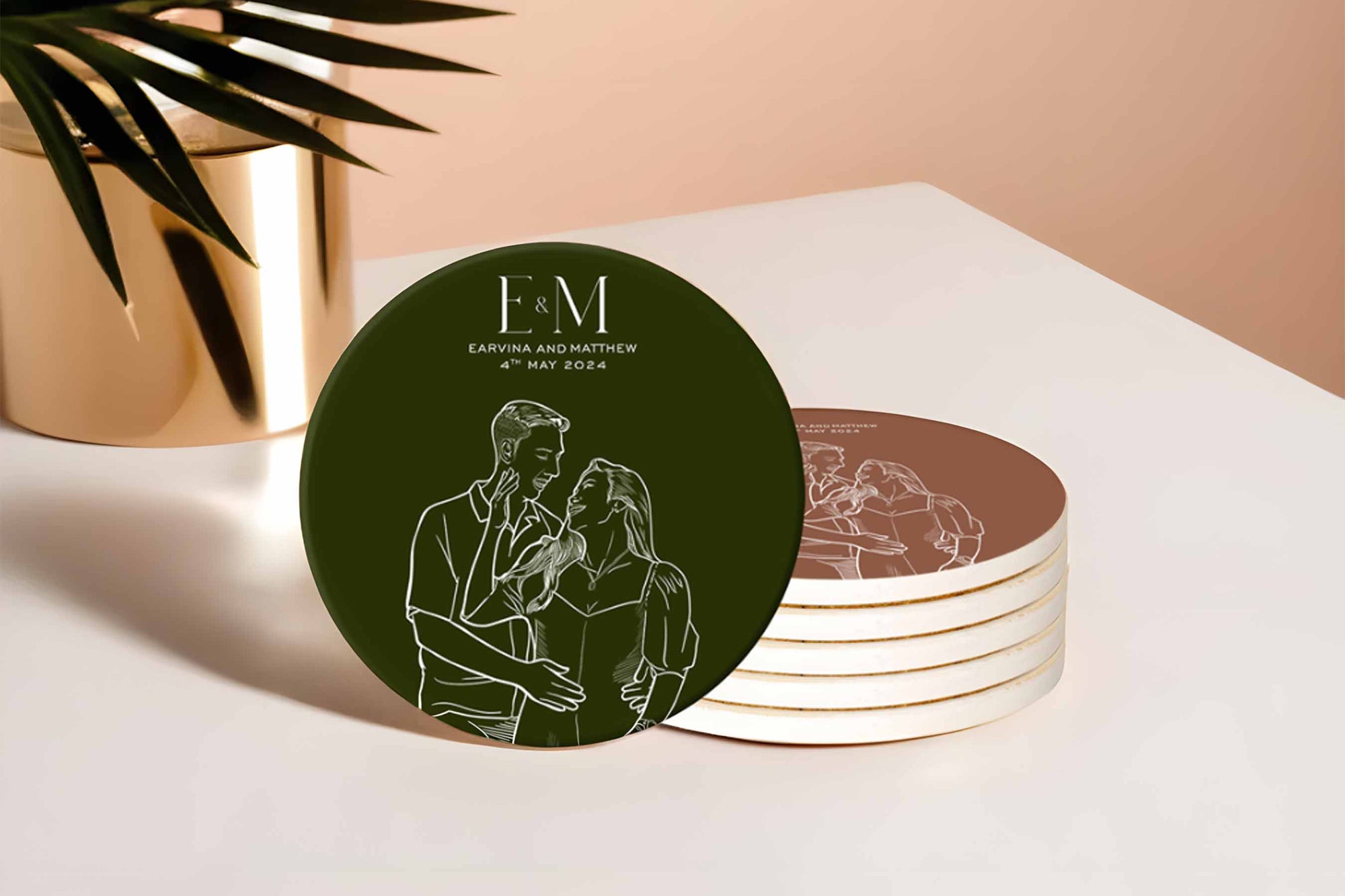 Mark the joyous journey of the newlyweds with our exquisite set of ceramic coasters. Featuring stunning hand-drawn artwork of the bride and groom, these unique keepsakes are perfect for celebrating their love and creating lasting memories.